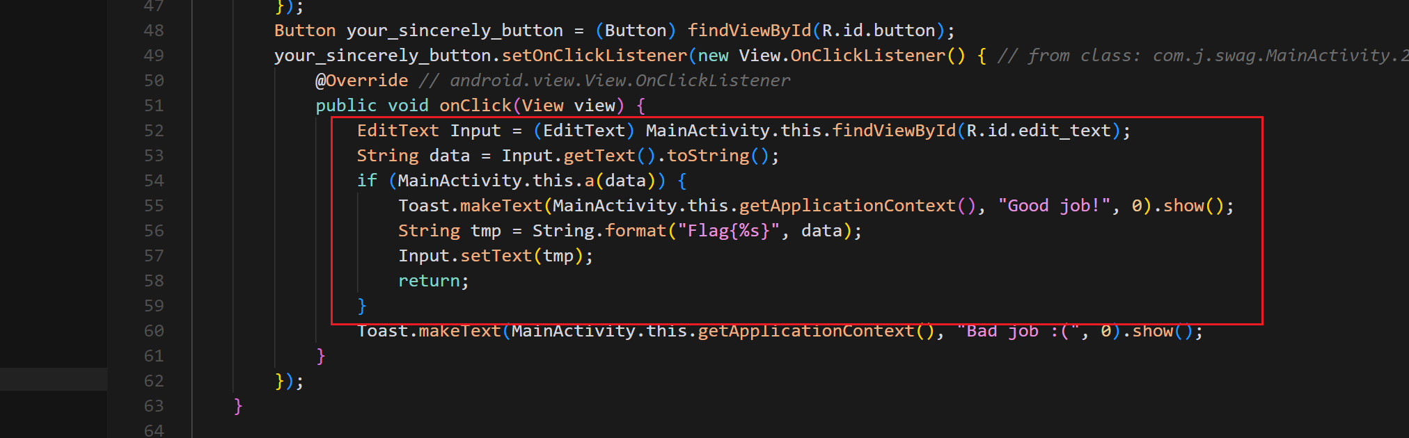 | v4 = (*(__int64 (__fastcall **)(_QWORD, const char *))(*(_QWORD *)v5[0] + 48LL))(v5[0], "com/j/swag/MainActivity");
